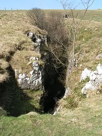 350 metres south of the summit lies Eldon Hole. At 55 metres it is the deepest pothole in the area and was named as one of the Seven Wonders of the Peak by the philosopher Thomas Hobbes in 1636.[8] According to folk tradition, it is the abode of the Devil.[9] Close to the summit of the hill lies a Bronze Age tumulus, a large burial site measuring 16 by 15 metres and 1.5 metres high. The tumulus, a Scheduled Monument,[10] has been excavated on several occasions with human skeletons and jewellery amongst the finds.[11] The hill is dotted with numerous lead mines, all disused and many capped off for safety.