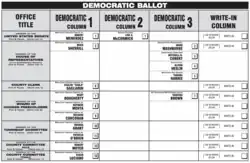 The county line or party line refers to the first column of the ballot which includes candidates for federal, state, and local offices who have received the endorsement of the county party while non-endorsed candidates are listed in other columns.[15]