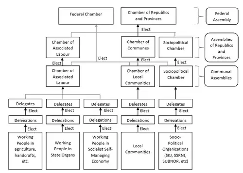The Federal Council was elected by a complicated indirect delegate system through the popular front Socialist Alliance of Working People of Yugoslavia.[2] The Federal Council was composed of 220 members. Its members were elected from the six republics (with 30 members each) and the two autonomous provinces (with 20 members each).