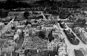During the Nazi era, an amphitheatrical Thingplatz theatre was created in the palace forecourt. It was one of the first of a projected 400 to be built; in March 1934 building materials were brought up from the Rhine by citizens,[4] over 100 workers began work in two shifts on 8 June, a mystical cornerstone-laying ceremony took place on 16 June, and the theatre was dedicated by Mayor Otto Wittgen on 24 March 1935.[5] The theatre was oval, 100 metres (330 ft) long by 70 metres (230 ft) wide and approximately 5 metres (16 ft) deep; it was constructed using 16,000 basalt pillars, seated 20,000 people and could accommodate a further 80,000 standees in the surrounding areas of the forecourt.[5] The layout incorporated a glacial boulder and, under the palace portico, a memorial grotto with an eternal flame.[4] The motto of the theatre was Leuchte, scheine goldene Sonne über dies befreite Land (Gleam, shine golden sun, over this liberated land), and a lur was installed on the palace roof, to be sounded twice daily. It was audible up to 5 kilometres (3.1 mi) away.[4] The Koblenz Thingplatz was one of the most important in the effort to use the locations for mystical observances, particularly at the summer solstice.[6] However, interest in the Thingspiel movement waned rapidly, and already at the end of 1937 a contest was organised to redesign the forecourt as a simple parade ground, doing away with the amphitheatre;[7] in later years it was mainly used for the annual May Day ceremonies. After World War II, it was filled in with debris from the bombing of the city.[5]