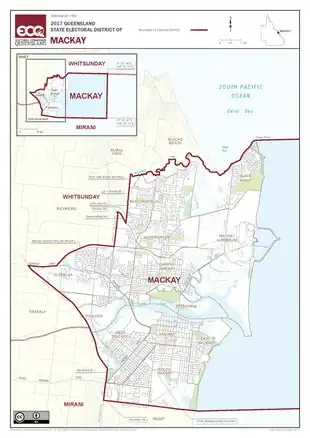 Mackay is a Legislative Assembly of Queensland electoral district in North Queensland, Australia, encompassing the inner suburbs of the city of Mackay. Outer suburbs of the city are included in the neighbouring electorates of Mirani and Whitsunday.[1]