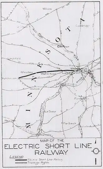 The Electric Short Line Railway and the affiliated Electric Short Line Railroad (later renamed the Electric Short Line Terminal Co.) were incorporated in late 1908. Construction started in 1909, but it took until 1913 for the first 3.2 miles (5.1 km) to be completed from 3rd Avenue and 7th Street North (construction was in various stages of completion for the next 30 miles, however).[1] That spot was originally known as Boagen Green, then became Luce Line Junction when the Dan Patch Line reached it. It eventually became known as Glenwood Junction. Rail east of that point was owned by the ESL Terminal Co., while rail to the west was owned by the ESL Railway. 17.8 miles were complete by mid-1914, 47.5 by mid-1915, and 70.9 miles by the end of 1917 (although some of this included double-tracking), reaching Hutchinson.