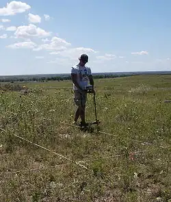 Survey usually involves walking with the instrument along closely spaced parallel traverses, taking readings at regular intervals. In most cases, the area to be surveyed is staked into a series of square or rectangular survey "grids" (terminology can vary). With the corners of the grids as known reference points, the instrument operator uses tapes or marked ropes as a guide when collecting data. In this way, positioning error can be kept to within a few centimeters for high-resolution mapping. Early surveys recorded readings by hand, but computer controlled data logging and storage are now the norm.[9]