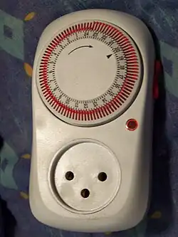 In general, halacha permits a Jew to begin a Shabbat-violating action on Friday (before Shabbat) even though the action will be completed automatically on Shabbat.[68] Therefore, the consensus of contemporary authorities permits a Jew to program a timer (referred to as a "Shabbat clock") before Shabbat to perform automatically a prohibited action on Shabbat.[69] For example, it is permitted to attach a timer to a light switch on Friday afternoon so that the light will turn off late on Friday night when people wish to sleep, and will turn on again the next day when people are awake.