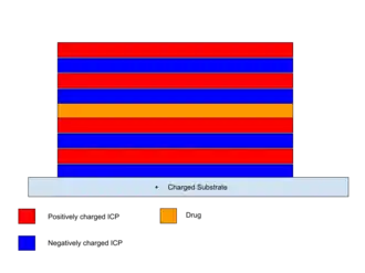 Electro-responsive drug delivery systems are usually composed of intrinsically conducting polymers (ICPs) which are polymers with electrical properties that can alter its structure in the presence of an electrical field.[1] With its electrical properties, intrinsically conducting polymerss can be formed into thin films by attracting them with electrodes. Many different nanostructures can be formed to create bulk reservoirs so that drugs can be stored within. An intrinsically conducting polymer known as polypyrroles can be shaped to have a wire-like structure when doped or contained with adenosine triphosphate (ATP) with almost all of the ATP being released when a negative voltage is used.[2] ATP is typically used in many drug release experiments as ATP is a small negatively charged molecule that can be used as a model for charged drugs. intrinsically conducting polymers can also be prepared by layer-by-layer technique (LbL) which stacks ultrathin layers of alternating polymer charges to encapsulate a drug layer.[3] When exposed to an electric potential, the entire stack disassembles due to electrostatic repulsion leading to release of the drug as seen in Figure 1. With the development of colloidal lithography, nanoparticles can be used as a template to create molds attached to an electrode. The technique immerses the electrode-nanoparticle mold into a solution containing monomer and drug which is then bonded to the mold with an electrical current. When the nanoparticles are removed through a solvent, the process creates a porous nanofilm. These create higher surface area to volume structures that release drug in under a minute upon exposure to an electrical voltage.[4]