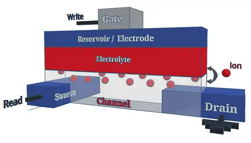 Electrochemical Random-Access Memory (ECRAM) is a type of non-volatile memory (NVM) with multiple levels per cell (MLC) designed for deep learning analog acceleration.[1][2][3] An ECRAM cell is a three-terminal device composed of a conductive channel, an insulating electrolyte, an ionic reservoir, and metal contacts. The resistance of the channel is modulated by ionic exchange at the interface between the channel and the electrolyte upon application of an electric field. The charge-transfer process allows both for state retention in the absence of applied power, and for programming of multiple distinct levels, both differentiating ECRAM operation from that of a field-effect transistor (FET). The write operation is deterministic and can result in symmetrical potentiation and depression, making ECRAM arrays attractive for acting as artificial synaptic weights in physical implementations of artificial neural networks (ANN). The technological challenges include open circuit potential (OCP) and semiconductor foundry compatibility associated with energy materials. Universities, government laboratories, and corporate research teams have contributed to the development of ECRAM for analog computing. Notably, Sandia National Laboratories designed a lithium-based cell inspired by solid-state battery materials,[4] Stanford University built an organic proton-based cell,[5] and International Business Machines (IBM) demonstrated in-memory selector-free parallel programming for a logistic regression task in an array of metal-oxide ECRAM designed for insertion in the back end of line (BEOL).[6] In 2022, researchers at Massachusetts Institute of Technology built an inorganic, CMOS-compatible protonic technology that achieved near-ideal modulation characteristics using nanosecond fast pulses.[7]