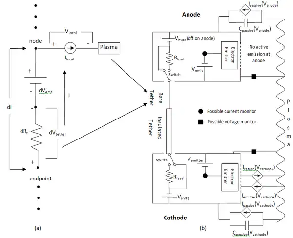 (a) A circuit diagram of a bare tether segment with (b) an equivalent EDT system circuit model showing the series bias grounded gate configuration