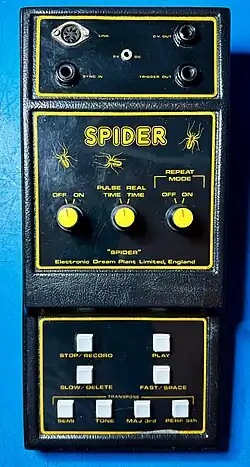 The Spider was a 252-step digital sequencer (most analogue sequencers at the time had 8 or 16 steps). The unit was designed by Huggett and Oxford University engineering technician Steve Evans. It was built in the same style as the standard Wasp, outputting both LINK (to drive EDP products) and CV/gate information for use with standard analogue synths. It was programmable in real time or by individual step entry.[1][6]