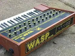 Launched in 1978 at a price of £199 (equivalent to £1,442 in 2023),[2] the Wasp was EDP's best-received product. It was named after its black-and-yellow colour scheme. For cost reasons, it did not have a mechanical keyboard; instead, it used flat conductive copper plates, hidden under a silk-screened vinyl sticker.[1] This alienated some players who thought the instrument lacked the expression present with a real keyboard.[3] It was also difficult to use in live settings, and according to Gerald Casale of Devo, the synth would play itself when exposed to sweat.[4] Despite these flaws, the Wasp was fairly advanced technologically. It was one of the first commercially available synthesisers to adopt digital technology, which at the time was just beginning to become a standard. It also utilised a proprietary system for connecting several Wasp synthesisers together, predating MIDI by several years.[1][a] The Wasp had a tiny internal speaker, which gave the instrument a distinctive sound, though it could also be amplified externally. Eurythmics' David A. Stewart recorded the Wasp by miking its internal speaker.[1]