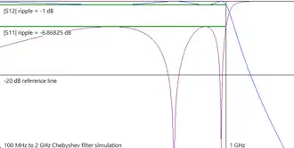It may be useful to do some quick validity checks at this point. Since the example Chebyshev filter design requirement is for -1dB attenuation at the cutoff frequency of 1GHz, |S12| at 1 GHz is expected to be -1dB. Furthermore, since all simulation elements are lossless, the well known relation, |S11|2+|S12|2 = 1[10] applies at all frequencies, including 1GHz.