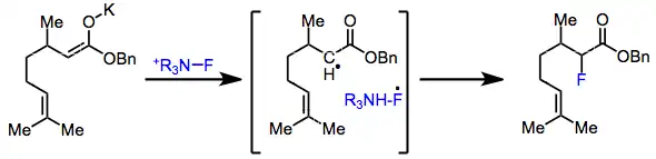 On the other hand, the lifetime of radicals in the SET process is predicted to be four orders of magnitude shorter than the detection limit of even the most sensitive of radical probes. It has been postulated that after electron transfer, immediate recombination of the fluorine radical with the alkyl radical takes place.[5]