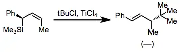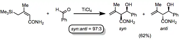 Allylsilane additions to carbonyl groups are common and synthetically useful. Vinylsilane additions are less common, as a variety of methods to access allylic alcohols are available (including epoxidation of allylsilanes; see below). If the γ position of the allylsilane is substituted, two diastereomeric products may result. In the presence of Lewis acids such as titanium tetrachloride, (E)-allylsilanes are highly selective for the syn diastereomer. (Z)-allylsilanes are much less selective (~60:40), but also favor the syn isomer.[13][14]