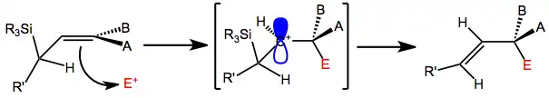Electrophilic substitution of unsaturated silanes involves attack of an electrophile on an allyl- or vinylsilane. An allyl or vinyl group is incorporated at the electrophilic center after loss of the silyl group.[1]