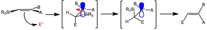 The carbon-silicon bond is highly electron-releasing and can stabilize a positive charge in the β position through hyperconjugation. Electrophilic additions to allyl- and vinylsilanes take advantage of this, and site selectivity generally reflects this property—electrophiles become bound to the carbon γ to the silyl group. The electron-donating strength of the carbon-silicon bond is similar to that of an acetamide substituent and equal to roughly two alkyl groups.[6] After formation of the carbon-electrophile bond, silicon elimination is assisted by a nucleophile.