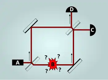- The photon was detected at D: The bomb is live but unexploded. That is because the photon in fact took the upper path and reflected off the second half-silvered mirror, something possible only because there was no photon from the lower path with which it could interfere. This is the only way that a photon can ever be detected at D. If this is the outcome, the experiment has successfully verified that the bomb is live despite the fact that the photon never "factually" encountered the bomb itself. There is a 25% chance that this will be the outcome if the bomb is live.[7]