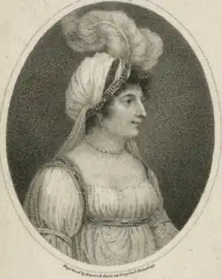 At Milan she was received with much favour by the Joséphine de Beauharnais, and here she met a young Frenchman, M. Felissent, to whom she was married in 1799. After her second marriage she went to live at St. Artien, an estate she had bought between Venice and Treviso; but her life was rendered so insupportable by the ill-treatment she received from her husband that in 1801 she left him and returned to England.[8] Felissent, who, it was said, had been publicly flogged as an impostor at Milan, followed her to London, but he was arrested and expelled the country as an alien.[4]
