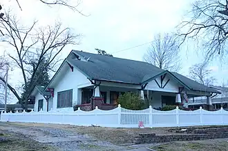 The Elliott House is a historic house at 309 Pine Street in Fordyce, Arkansas. The 1+1⁄2-story wood-frame house was built in 1925, and is a well-executed example of Craftsman style. It is a rectangular structure with three overlapping gabled roof sections with different pitches. The eaves are wide, and decorated with knee braces and exposed purlins. A fourth gable extends over the main entry, which has a twelve-light door with flanking sidelight windows.[2]