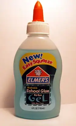 Immediately after World War II, the company expanded into synthetic resin glues and, in 1947, the first multipurpose consumer white glue, known as Elmer's Glue-All, was introduced.[7] The glue was packaged in a glass bottle with a Popsicle stick type wooden applicator attached with a rubber band. Consumer feedback confirmed a need for an easier to use delivery method, which prompted the company to develop easy to squeeze bottles featuring a twistable orange cap, introduced in 1962. This innovation remains in use and is a trademark of Elmer's Products.[8]