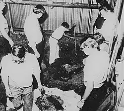Seventeen victims in varying stages of decomposition would be recovered from the boat shed on August 8 and 9, with four separate arm bones not belonging to any victim—each appendage later confirmed to belong to the same individual—also recovered on the second day of the search.[149] All of the victims found had been sodomized and most victims found bore evidence of having been subjected to brutality and sexual torture: pubic hairs had been plucked out,[n 9] objects had been inserted into their rectums, and glass rods had been inserted into their urethrae and smashed.[151] Cloth rags had also been inserted into the victims' mouths and adhesive tape wound around their faces to muffle their screams.[152] One victim had been emasculated, whereas the penis of another victim had been almost completely severed by human teeth. The eighth victim recovered was found buried with an electrical cord with alligator clips attached to each end;[153] the thirteenth and fourteenth bodies unearthed bore identification cards naming the victims as brothers Donald and Jerry Waldrop,[154] whereas the body of the fifteenth victim had suffered several fractured ribs prior to his murder.[155]