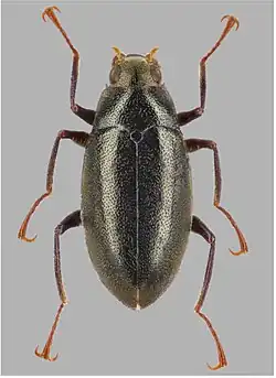Adults reach a length of 2.93–3.09 mm (males) and 3.15–3.32 mm (females). Their body is oblong oval and integument black, while the mouthparts, antennae and tarsi are reddish-brown.