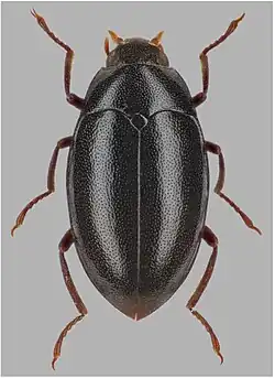 Adults reach a length of 3.36–3.89 mm (males) and 3.24–3.96 mm (females). Their body is broadly oval, strongly convex dorsally and integument black. The mouthparts, antennae, trochanters, and tarsi are reddish brown.