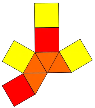 The elongated square pyramid is a composite, since it can constructed by attaching one equilateral square pyramid onto one of the faces of a cube, a process known as elongation of the pyramid.[2][3] One square face of each parent body is thus hidden, leaving five squares and four equilateral triangles as faces of the composite.[4]