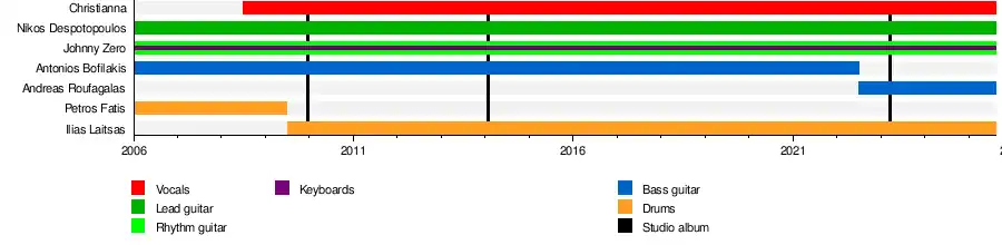 The band members are Christiana Hatzimihali (lead vocals), Johnny Zero (guitar),[1] Andreas Roufagalas (bass guitar), Nikos Despotopoulos (guitar) and Ilias P. Laitsas (drums).