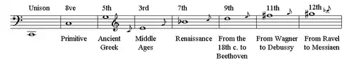 Just as the harmonic series was and is used as a justification for consonance, such as by Rameau, among others, the harmonic series is often used as physical or psychoacoustic justification for the gradual emancipation of intervals and chords found further and further up the harmonic series over time, such as is argued by Henry Cowell in defense of his tone clusters. Some argue further that they are not dissonances, but consonances higher up the harmonic series and thus more complex. The musicologist Jacques Chailley,[7] cited by Jean-Jacques Nattiez,[8] gives the following diagram, a specific timeline he proposes: