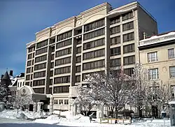 The hotel finally underwent a $5 million renovation in 1983 to turn it into a luxury hotel.[20] The newly renovated hotel was rededicated in late April 1983.[21] Alejandro Orfila, the Secretary General of the Organization of American States, performed the ribbon-cutting.[21] Ann Grey, an interior decorator known for her work on deluxe hotels in the United States, redesigned the hotel interior.[20] Many of the hotel's small rooms were enlarged and 28 suites created.[22] Other changes included offering a free, full breakfast to all guests, offering luxury bath and toilet items,[22] putting television sets into armoires rather than hanging them from brackets on the walls, and adding an herb garden on the roof for the restaurant's use.[21] Le Consulat was closed, and a new restaurant named La Reserve opened with a lower-priced menu.[23]