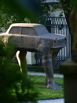 These events are commemorated by a golden statue of a Trabant car on four legs in the garden of the embassy.[1] The sculpture is the work of the Czech sculptor David Černý.[2]