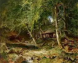 In 1881, he was awarded the Reichel-Preis [5] which came with a cash award of 1,500 florins, enabling the family to rent a large new apartment that was previously occupied by Passy-Cornet, who had moved to Budapest. Winning the prize also served to attract more clients and their financial condition continued to improve. From 1885 onwards, he rented the Castle Plankenberg, near Neulengbach,[5] where he spent his summers and established an artists' colony. He had several students there, including Marie Egner, his former studio mate Tina Blau, Olga Wisinger-Florian and Luise Begas-Parmentier. Two years later (1887), he received a commission from Rudolf, Crown Prince of Austria to sketch the coastal scenery in Dalmatia and on the island of Corfu, as part of a grand project called The Austro-Hungarian Monarchy in Word and Picture.[5] That same year, he became an honorary member of the Vienna Academy.[2] In 1888, the Munich Academy followed suit.