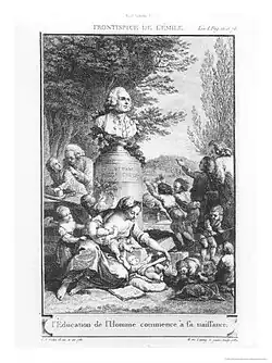 Emile, or On Education (French: Émile, ou De l’éducation) is a treatise on the nature of education and on the nature of man written by Jean-Jacques Rousseau, who considered it to be the "best and most important" of all his writings.[1] Due to a section of the book entitled "Profession of Faith of the Savoyard Vicar", Emile was banned in Paris and Geneva and was publicly burned in 1762, the year of its first publication.[2] It was forbidden by the Church being listed on the Index Librorum Prohibitorum.[a] During the French Revolution, Emile served as the inspiration for what became a new national system of education.[3] After the American Revolution, Noah Webster used content from Emile in his best-selling schoolbooks and he also used it to argue for the civic necessity of broad-based female education.[4]