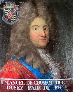 - François de Crussol (1679–1736), styled, Count of Uzès, a Lieutenant General of the King's Armies and Master of the Cavalry Camp who became Governor of Oléron; he married Madeleine Charlotte Pasquier de Franclieu.[12] After her death in 1713, he married Marie-Anne Commeau, the widow of Pierre Bailleul.[13]