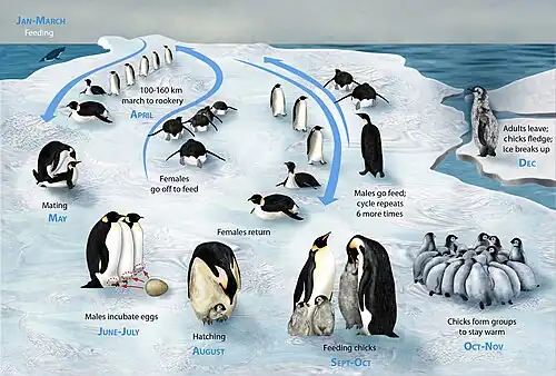Although emperor penguins can breed at around three years of age, they generally do not begin breeding for another one to three years.[19] The yearly reproductive cycle begins at the start of the Antarctic winter, in March and April, when all mature emperor penguins travel to colonial nesting areas, often walking 50 to 120 km (31 to 75 mi) inland from the edge of the pack ice.[71] The start of travel appears to be triggered by decreasing day lengths; emperor penguins in captivity have been induced successfully into breeding by using artificial lighting systems mimicking seasonal Antarctic day lengths.[72] The British Antarctic Survey used satellite imagery to find new emperor penguin breeding sites in Antarctica, a discovery that increased the estimated population of the emperor penguins by 5 to 10 percent to around 278,000 breeding pairs. Given their remote locations and harsh weather conditions, penguin populations are found by scanning aerial imagery and locating enormous pages of ice that have been stained with their guano. The new discoveries increased the number of known breeding sites from 50 to 61.[73]
