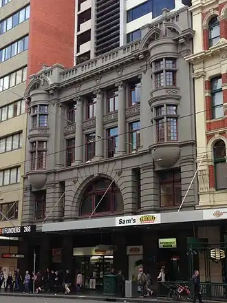 Originally known as the Empire Arcade, the building was designed by Nahum Barnet and constructed in 1906.[2] It housed a variety of different uses, with a dead-end retail arcade at ground level and 'rooms' above, accommodating over the years the usual array of specialist uses found in city buildings such as a cafe on the first floor, a ladies training college, a dressmaker, a tailor, a poultry specialist, and a meeting room for hire. The Empire Arcade was nearly gutted by a spectacular fire in 1923, resulting in losses exceeding at £70,000 but it was quickly rebuilt in the following years.[3] In 1955 it was purchased by the adjacent Mutual Store, and underwent a range of modifications. These included absorbing the arcade space, creation of entries through the party wall, the reconfiguration of entries and internal circulation, and the addition of a modern canopy.[4] In 1965, the store closed and the two buildings became the city home of the College of Advanced Education for 40 years.[5] The Mutual Store and the Empire Building were redeveloped by the developer Baycrown and architects ClarkeHopkinsClarke, beginning in 2001. The redevelopment was finished in 2006. Designed by ClarkeHopkinsClarke Architects, a small front section of the Empire Building was retained, and a 14 storey tower added behind. Retail spaces still take up the entirety of the ground floor, albeit no longer in an arcade format. The rest of the project is given over to small to medium-sized apartments. Because of the poor state of the building’s façade, the developer contracted a specialist firm to rebuild the mouldings, urns, and other features, and the original sandy yellow colour of the building was painted over in grey. This redevelopment required the balancing of heritage guidelines, commercial imperatives and the City of Melbourne Planning Scheme. Council required the retention of the street canopies to Flinders Street to provide continuous street shelter for pedestrians and to create an active edge to both Flinders and Degraves Street.