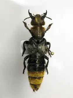 Emus is a genus of rove beetles with long, matted yellow, black, and grey hairs on the pronotum and parts of the abdomen.[3]