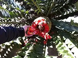 | Female cone of Encephalartos ituriensis showing red seeds and dripping "nectar." | |