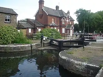 A lock on this site has been extant since 1725. The present day structure was re-built in 1922.[2] At the lock are red brick cottages and a Lee Conservancy Board toll office of 1889.[3] Below the lock, a water maintenance depot, with clock turret on the cruciform planned office building of 1907.[3]