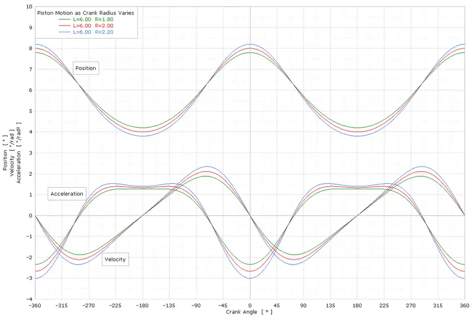 - Connecting rods (rotating around the piston end as required by the varying horizontal offset between the piston and the crank throw)