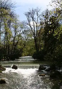 Thompson left Munich in 1798. His successor, Baron von Werneck, attempted to make the garden itself through its agricultural use. To that end he expanded the park in December 1799 to encompass the Hirschau, which was improved to provide pasture. The fields of the military gardens were added to the Englischer Garten in January 1800. Werneck's improvements had been costly, and in 1804 he was replaced by Sckell, who was given the post of Bayerischer Hofgärtenintendant ("Bavarian Court Garden Supervisor").[14] Although Sckell had had a guiding role from the beginning, many aspects of the execution differed from his ideas, which he set out in a memorandum of 1807.[15] His long supervision of the garden (1804–1823) was marked by a movement away from agricultural uses and by concentration on the landscape garden. For instance, two mills at the point where the Schwabingerbach (Schwabing stream) leaves the Eisbach (Ice stream) were removed and an artificial waterfall was created in 1814–1815.[16]