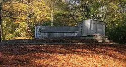 Two monuments near the lake honour its creators. The Werneck-Denkmal, a monument to Werneck, stands on a rise near the east side. It was erected in 1838 on Ludwig I's suggestion to a design by von Klenze.[43] A little south of it, on the bank of the lake, the Sckell-Säule ("Sckell pillar") honours Ludwig von Sckell. This, also designed by von Klenze, was erected in 1824, a year after Sckell's death; the design was executed by Ernst von Bandel, who would later be known as the creator of the Hermannsdenkmal.[44]