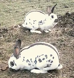 The English Spot Rabbit is believed to be one of the oldest breeds of rabbit whose origins trace back to the 19th century.[1] The exact origin of the English Spot is unknown, but they are believed to have come from the English Butterfly or Checkered Giant due to their shared physical features, such as cheek spots, butterflies, eye circles, colored ears, and a herringbone.[2]