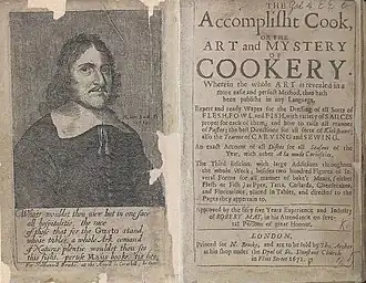 Robert May's The Accomplisht Cook was published in 1660 when he was 72 years old.[13] The book included a substantial number of recipes for soups and stews,[14] 38 recipes for sturgeon, and a large number of pies variously containing fish (including sturgeon), meat (including battalia pie), and sweet fillings.[15]
