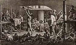 The art of engolo spread from Africa to the Americas, mainly among enslaved people taken from Angola and transported to the colonies via the Atlantic slave trade routes. The art has been maintained for centuries, and its traces have survived to this day among the African diaspora. It descendant arts include knocking and kicking in North America, danmyé in Martinique and capoeira in Brazil.[6] Knocking and kicking was secretly practiced in the states of South Carolina and Virginia, during the times of slavery in the United States. Angolans were the predominant portion of the enslaved population in South Carolina.[29] Gwaltney characterizes knocking and kicking as "the ancient martial art practiced by clergy among the enslaved and their followers."[30] The "clergy" of the old African religion was known as nganga in Congo/Angola. These clandestine gatherings were often referred to as "drum meetings."[30]