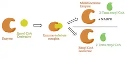 Mitochondria (both short- and long-chain) of rat liver contain more than one enoyl Co-A isomerase.[10] To further support the idea that short- and long-chain isomerases elute at different concentration of potassium phosphate concentration, they do not share similar primary polypeptide structure, hence they must not be evolutionarily related.[6][11] Peroxisomes of plants and of rat liver are very different in the way they operate. Despite their primary structure similarities, there are differences among the different specimen. To begin with, the peroxisomes of rat liver are a multifunctional enzyme including enoyl-CoA isomerase, enoyl-CoA hydratase, and L-(−)-3-hydroxyacyl-CoA dehydrogenase.[12] Three different enzymes reside on this entity (multifunctional protein) allowing this enzyme to perform isomerization, hydration, and dehydration.[13][14] Isomerase activity on the multifunctional enzyme occurs at the amino-terminal catalytic half of the protein along with the hydratase activity.[15] The dehydrogenase activity of enoyl-CoA occurs in the carboxyl-terminal.[15] Upon further investigation of the CoA binding site on the amino-terminal half of the multifunctional protein, the CoA substrate is not transferred through the aqueous phase from the isomerization phase to the site of hydration or does not have a bulk phase.[11][16] This removes the need for a substrate transferring enzyme.[17] On the other hand, the cotyledons convert long-chain 3-trans-enoyl-CoA, long-chain 3-cis-enoyl-CoA, and short-chain 3-cis-enoyl-CoA species into their 2- trans-enoyl-CoA respective forms.[13] As previously mentioned, plant enoyl-CoA isomerase exclusively forms the 2-trans isomer as product. It does not act on 4-cis-enoyl-CoA species or 2-trans- 4-trans-dienoyl-CoA species.[13] In comparing the products of the plant peroxisome and the multifunctional enzyme of rat liver, the plant has no hydratase activity.[13] The Plant form did not form a 2-cis-isomer (from enoyl-CoA hydratase) or D- or L- 3 hydroxy derivative (L-(−)-3-hydroxyacyl-CoA dehydrogenase): products of multifunctional enzyme of rat liver.[13] The turnover rates of these the two sub divisions of peroxisomes are very different. The Kcat/Km ratio in cotyledons is 10^6 M-1s-1 which outperforms the ratio .07 * 10^6 M-1s-1.[13] Due to a high turnover rate, the plant peroxisomes contain a lesser amount of enoyl-CoA isomerase than their counterparts in the rat liver.[13]