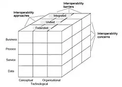 Interoperability concerns: data, service, process, and business - Interoperability barriers: Interoperability barrier is a fundamental concept in defining the interoperability domain. Many interoperability issues are specific to particular application domains. These can be things like support for particular attributes or particular access control regimes. Nevertheless, general barriers and problems of interoperability can be identified; and most of them being already addressed,[2][7][8] Consequently, the objective is to identify common barriers to interoperability. By the term ‘barrier’ we mean an ‘incompatibility’ or ‘mismatch’ which obstructs the sharing and exchanging of information. Three categories of barriers are identified: conceptual, technological and organisational.