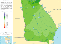 The majority of Georgia has primarily a humid subtropical climate tempered somewhat by occasional polar air masses in the winter. Hot and humid summers are typical, except at the highest elevations. The entire state, including the north Georgia mountains, receives moderate to heavy precipitation, which varies from 45 inches (1,100 mm) in central Georgia[26] to approximately 75 inches (1,900 mm) around the Northeast part of the state.[27] The degree to which the weather of a certain area of Georgia is subtropical depends not just on the latitude, but also on how close it is to the Atlantic Ocean or Gulf of Mexico and the altitude. This is especially true in the mountainous areas in the northern part of the state, which are further away from ocean waters and can be up to 4,500 feet (1,400 m) or higher above sea level.