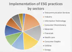 The implementation of ESG practices differs across sectors. The sectors of the industry, information technology, consumer discretionary, and materials are the sectors that have the biggest interest in the ESG practice (see figure 2).[48] According to the sector, the weights attributed to the relative importance of environmental, social, and governance factors change. Over time, the weighting of categories is subject to change. For instance, according to Nagy et al. (2020), the governance factor recorded a significant growth in weight, rising from 19% in 2007 to 27% in 2019 and then to 31% in 2020. Overall, an MSCI study revealed that: the average weight of the environmental pillar was 30%, social factors was 39%, and governance elements were 31% across all the sectors.[49]