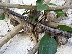 About 20% of the snails in a population survive to lay eggs in the 3rd year, 5% of the snails lay eggs again in the 4th year.[3] The mortality rates decrease with age.[3] The animals hibernate (in northern Greece) or aestivate (in Crete), but juveniles and adults show differences in their behaviour.[3] Adults dig into the soil and build an epiphragm, while juveniles search protected places under stones or leaves of low plants.[3]