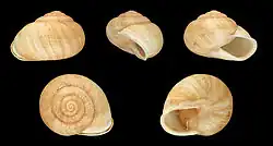 In this species the color of the shell is very variable. The background color can be whitish to greenish yellow, and the shell often has darker coloured bands or spots.[3] The ventral side of the shell frequently has two brown bands, and is whitish between the lowest band and the umbilicus.[3] The shell has 4-4.5 whorls.[3] The last whorl descends abruptly below the periphery of the shell.[3] The apertural margin is white, and is reflected (turned back)in adult shells, in juveniles this is true only on the columellar side.[3] The umbilicus is narrow and open in juveniles, only partly covered by the reflected columellar margin,; the umbilicus is however completely closed in adult shells.[3]